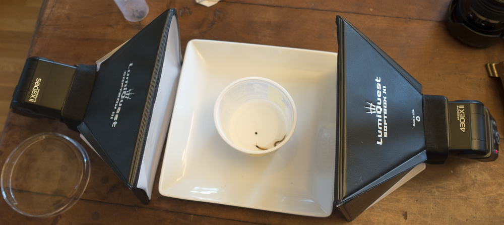 I aimed two flashes at the outside walls of the container, one on each side. These produced enough light to penetrate the white plastic walls of the container, and their short light pulses were great at stopping the centipede’s motion. The flashes happened to be mounted in softboxes, because I was using them for other subjects in the same session, but the softboxes weren't really needed. The container provided plenty of diffusion, and the interior reflected it all around, for a soft, nearly shadowless light.