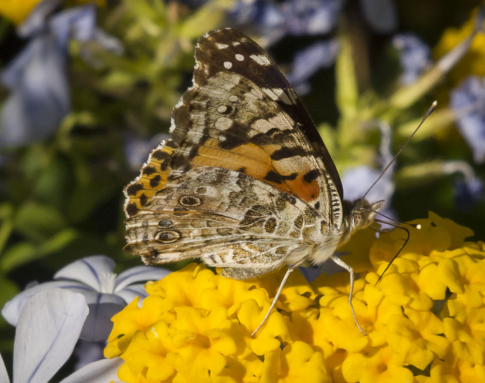 I had gone to Tucson for the weekend. On Saturday morning a butterfly was fluttering around the flowers next to my motel. When I returned that afternoon, it had been joined by several more. I decided to photograph them.