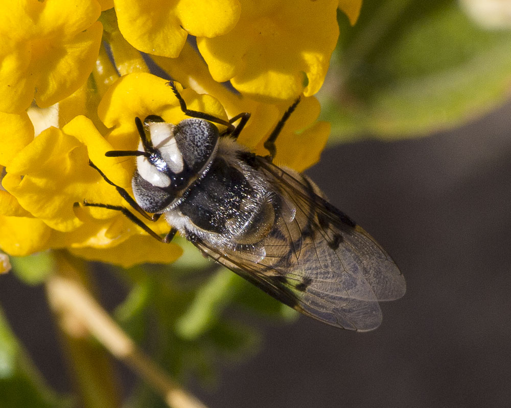 It's a female hoverfly of the species Copestylum fornax. Like bees, hoverflies are important pollinators, but unlike bees, they have no sting and are harmless to humans.