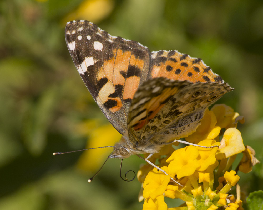 The next day the original butterflies were back. Several other species were also present, though in smaller numbers. I decided to be a little braver with focal length, so instead of the 40-150 zoom, I put the 70-300 mm lens on my camera and went back out to see whether this longer lens would work at all. With my Olympus camera, it’s roughly the equivalent of a 600mm lens on a full-frame DSLR, and I was still worried that I couldn’t hold it steady enough. But if it did work, it would give me images that needed little or no cropping.