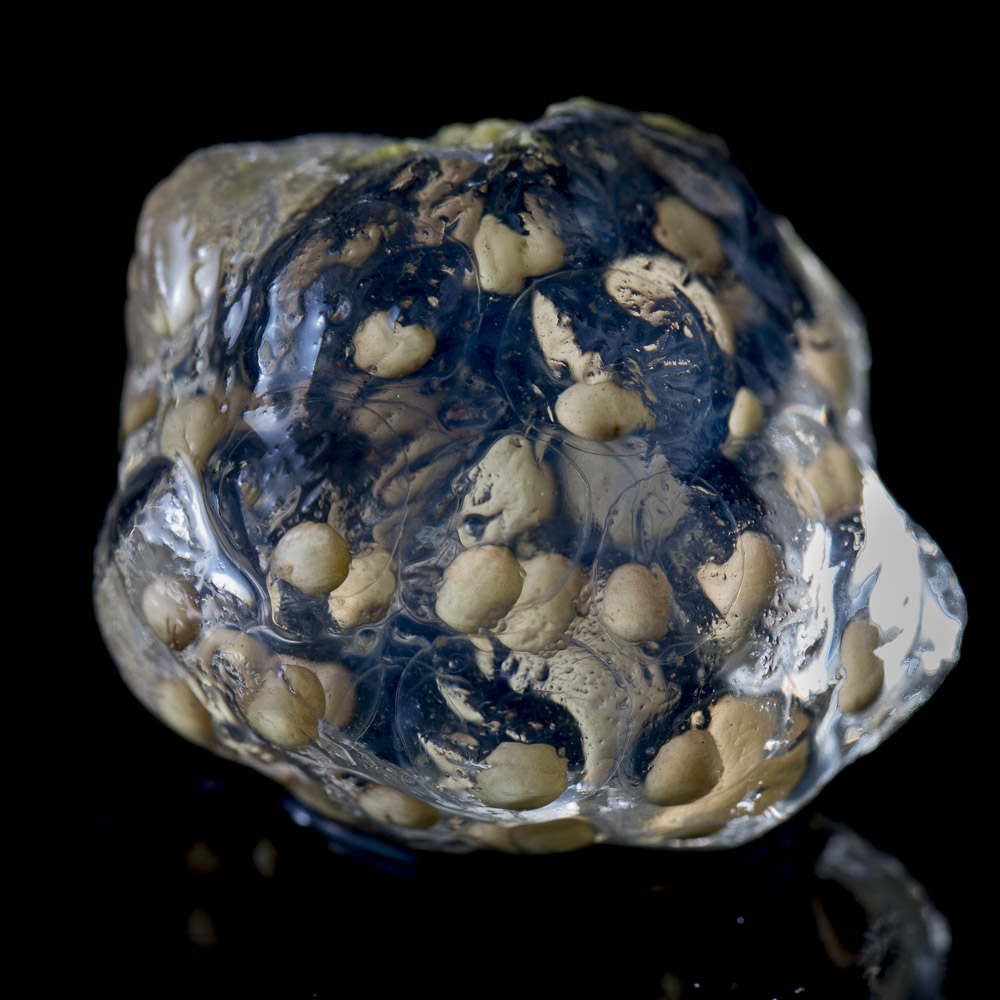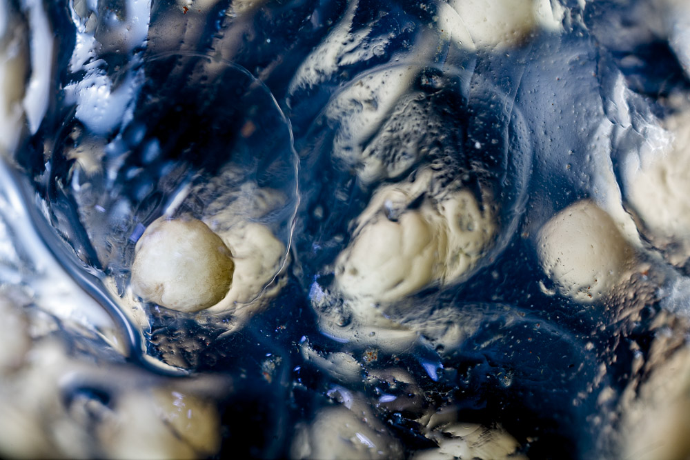 Photographing a transparent object is a lighting challenge. I didn't want a lot of clutter, so I taped together some black foam-core board to use as a background. Positioning flash units around the front and sides gave ugly results. There were way too many reflections, the glare from the surface obscured the eggs, and the whole surface looked as though it had a film over it. Since neither front nor side lighting was working, SImon suggested backlighting. I placed a single flash behind and to one side of the egg mass. Then I added another bit of foamcore to block direct light from the flash from hitting the lens. That worked! The transparent egg mass let light come through, and because of internal reflections, even the fronts of the eggs were illuminated.