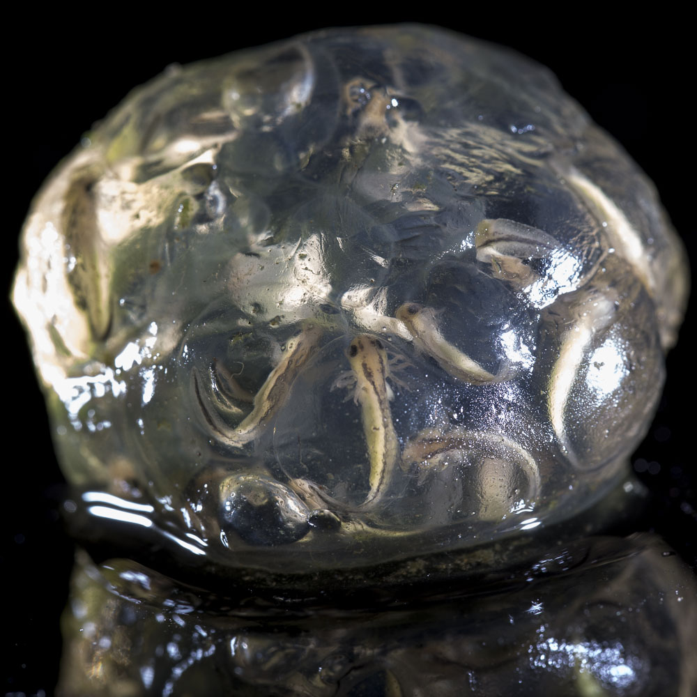 The pond water in the aquarium was not very clear, so to photograph the egg mass, we scooped it out of the aquarium and placed it on a black surface, restoring it to the aquarium once photography was finished.