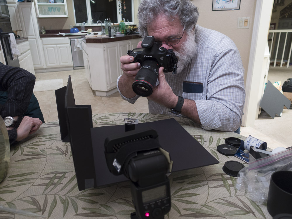 I used a Canon 5D mk iii, with a Canon 100mm f/2.8 macro lens. You can see how the flash is illuminating the cuvette from the rear. I've put a small inexpensive grid unit on the front of the flash. Grids narrow the flash beam, and I wanted to keep direct flash from striking the camera lens. The flash is being triggered wirelessly using a Cowboy Studio transmitter in the camera hotshoe and the corresponding receiver attached to the flash. These cheap triggers don't provide the full auto-flash capabilities of more expensive units, but when you're using manual settings for flash, it doesn't really matter. I set camera exposure and flash power manually, using the camera's histogram to home in on a correct exposure. With this much black in the scene, automatic flash control is likely to yield excessive exposure. Notice that my elbow is braced on the table for support.