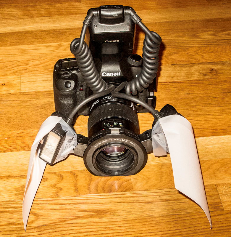 The most important parts of the equipment setup are the two index cards taped to the flash heads. Remember how Simon used open shade to get a nice, soft light on the snake. I’m using the index cards similarly, to soften the light. The flash heads point away from the snake, and the actual light for the photograph will come from reflection of the flash from the cards. This makes for a larger, softer light than if the flashes were aimed straight at the snake. The second important piece is the macro lens. This lens will go up to a magnification of 1:1. The snake won’t need that much magnification, but it needs much more than more common lenses would provide.