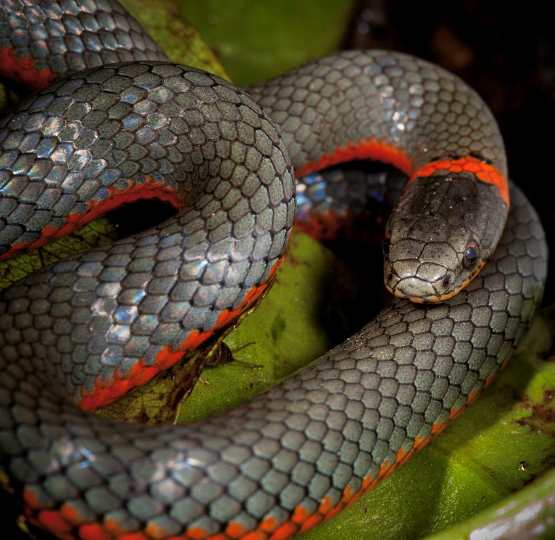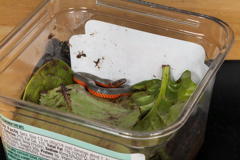 Moving closer allows us to eliminate the uninteresting container, and to see the snake face to face. Much better. The background looks like it could be outdoors, the snake’s eyes are in good focus, and the green leaf complements the snake’s beautiful orange belly and neck ring. You can see that parts of the snake are not fully in focus. The depth of field is very shallow in macro photography, and even at f/20 there are out-of-focus areas. A smaller aperture (f/32 is as far as this lens will go) would improve depth of field slightly, but there would still be areas of softer focus. Something that isn’t obvious is that this image has been darkened considerably on the right. That’s where the white label of the container was located, just to the right of the edge of the photo, and light bouncing off it mad that entire side of the image too light. I use Lightroom for much of my photo processing. It has a tool called a graduated filter that lets you apply adjustments such as reducing lightness in specific areas of a photograph. I used this tool in several parts of the photo to darken areas around the edge that were originally way too bright.